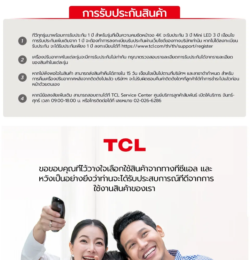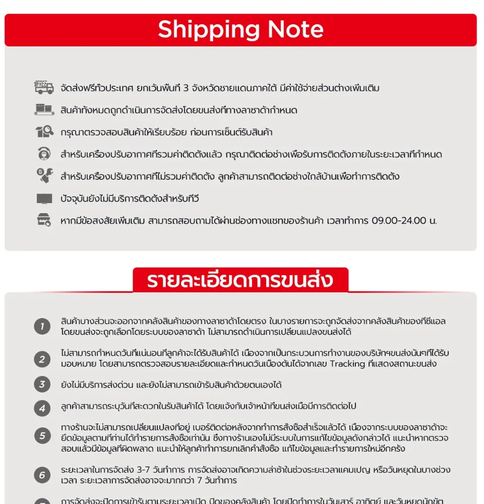 - หมายเหตุ : โปรดรักษาสิทธิ์ของท่านในการรับสินค้า เนื่องจากสินค้าในกลุ่มเครื่องใช้ไฟฟ้ามีราคาสูง หากท่านไม่ได้ถ่ายคลิปขณะแกะสินค้าเพื่อยืนยันความเสียหาย ถือว่าท่านได้ยอมรับสินค้านั้นแล้ว โดยที่ท่านจะไม่สามารถแจ้งคืนสินค้า, แจ้งเคลม หรือเรียกร้องความเสียหายใดๆได้