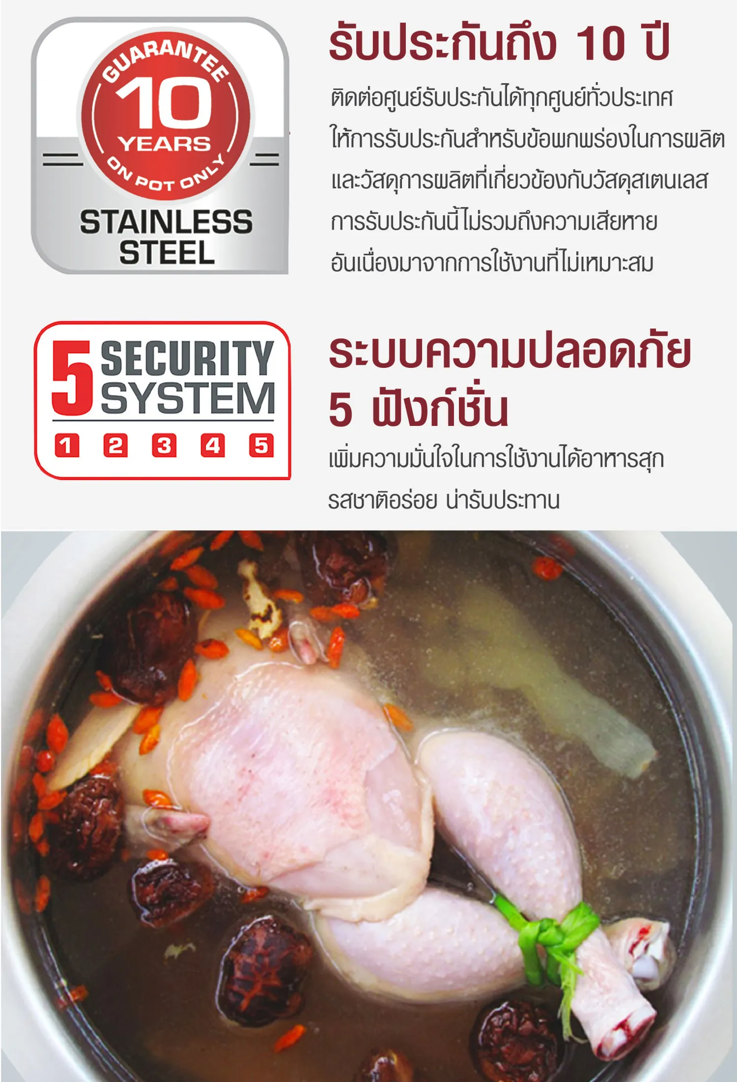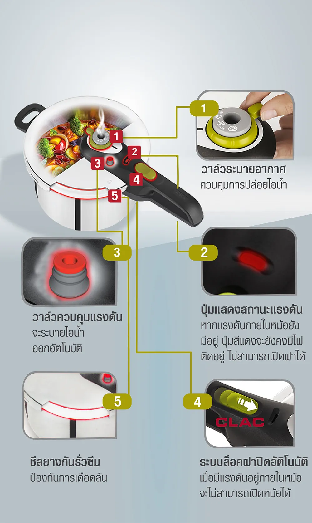 4. ระบบล็อคฝาปิดอัตโนมัติ เมื่อมีแรงดันอยู่ภายในหม้อจะไม่สามารถเปิดฝาหม้อได้