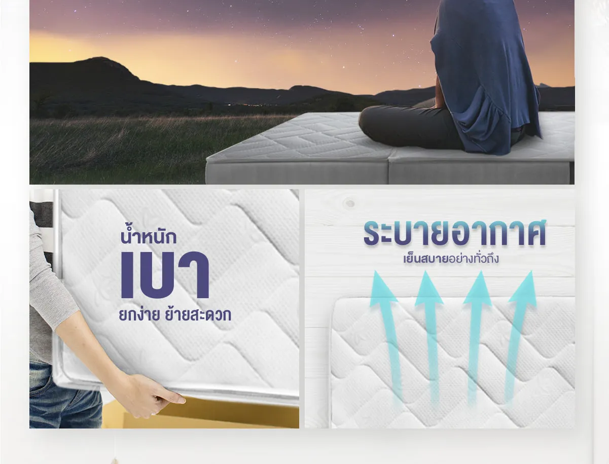 2 ดีไซน์ให้ง่ายต่อการใช้งานพื้นที่จำกัด พับ เก็บ สะดวก ได้ถึง 3 ทบ ประหยัดเวลา ประหยัดพื้นที่ นำไปใช้ได้ทุกโอกาสแห่งการพักผ่อน