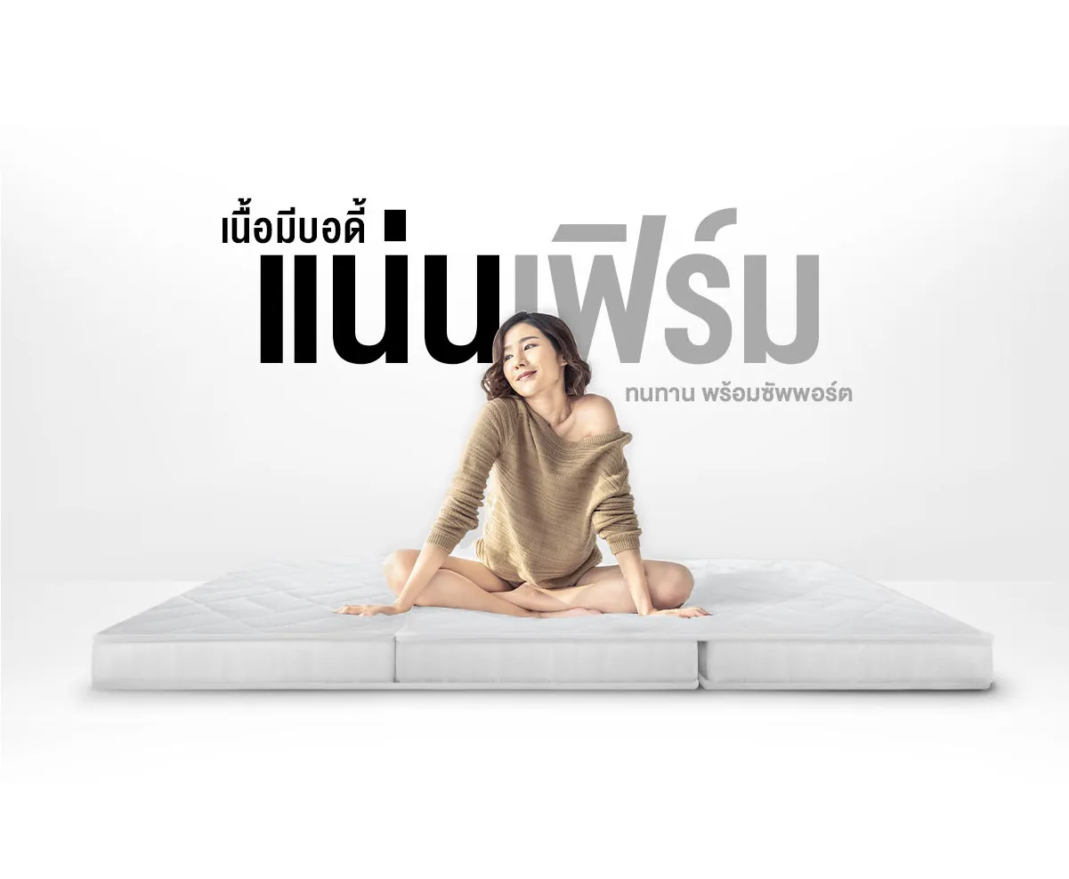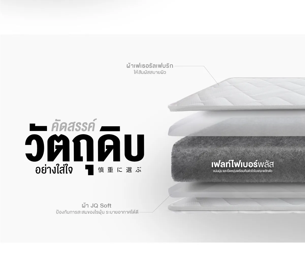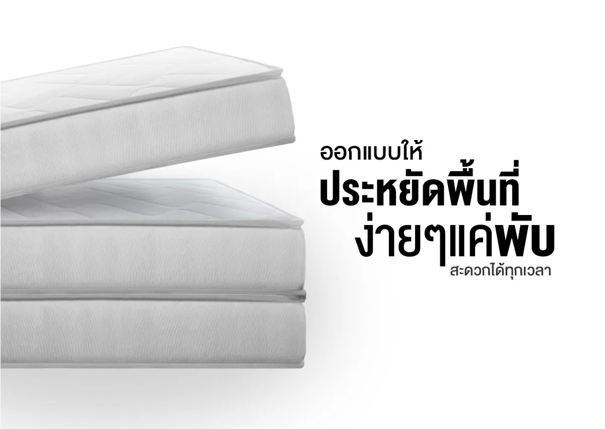4 ที่นอน 3 พับ ผลิตจากเส้นใยละเอียดของใยฟองน้ำนาโนเทคโนโลยี เฟลท์ไฟเบอร์ พลัส ให้ทั้งความนุ่ม และความยืดหยุ่นพร้อมคืนตัวไวในขณะพลิกตัว จะนอนดิ้นแค่ไหนก็ไม่สะดุ้งตื่น ช่วยให้คุณหลับสนิทจนถึงเช้า