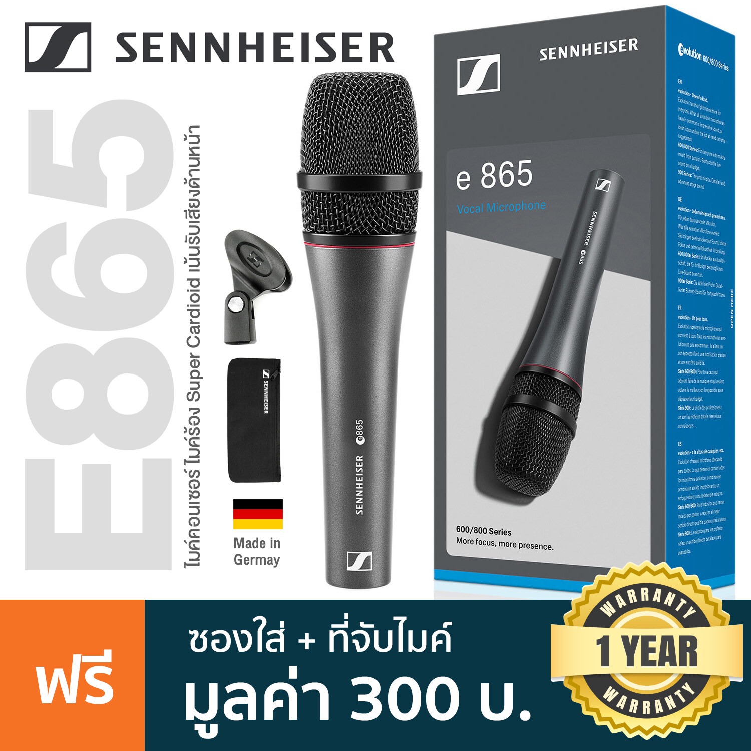 Sennheiser® E865 ไมโครโฟน ไมค์คอนเดนเซอร์ ระดับคุณภาพสูง ให้การตอบสนองต่อรายละเอียดของเสียงและโทนเสียงอันเป็นธรรมชาติ ใช้งานง่าย เมื่อเชื่อมต่อผ่าน XLR ก็สามารถใช้งานได้ทันที ระบบรับเสียงแบบ Super Cardioid (การรับเสียงด้านหน้ากว้างกว่าด้านหลัง) มีระบบป้องกันเสียงรบกวนจากด้านข้างและป้องกันเสียงสะท้อน วัสดุตัวไมค์ทำจากโลหะ ตะแกรงไมค์ทำจากลวดอะลูมิเนียมอย่างดี รองรับย่านความถี่ (ไมโครโฟน): 40 – 20000 Hz เหมาะการการแสดงสดบนเวทีหรือร้องเพลง Sennheiser® E865 มาพร้อมประกันศูนย์ 1 ปี